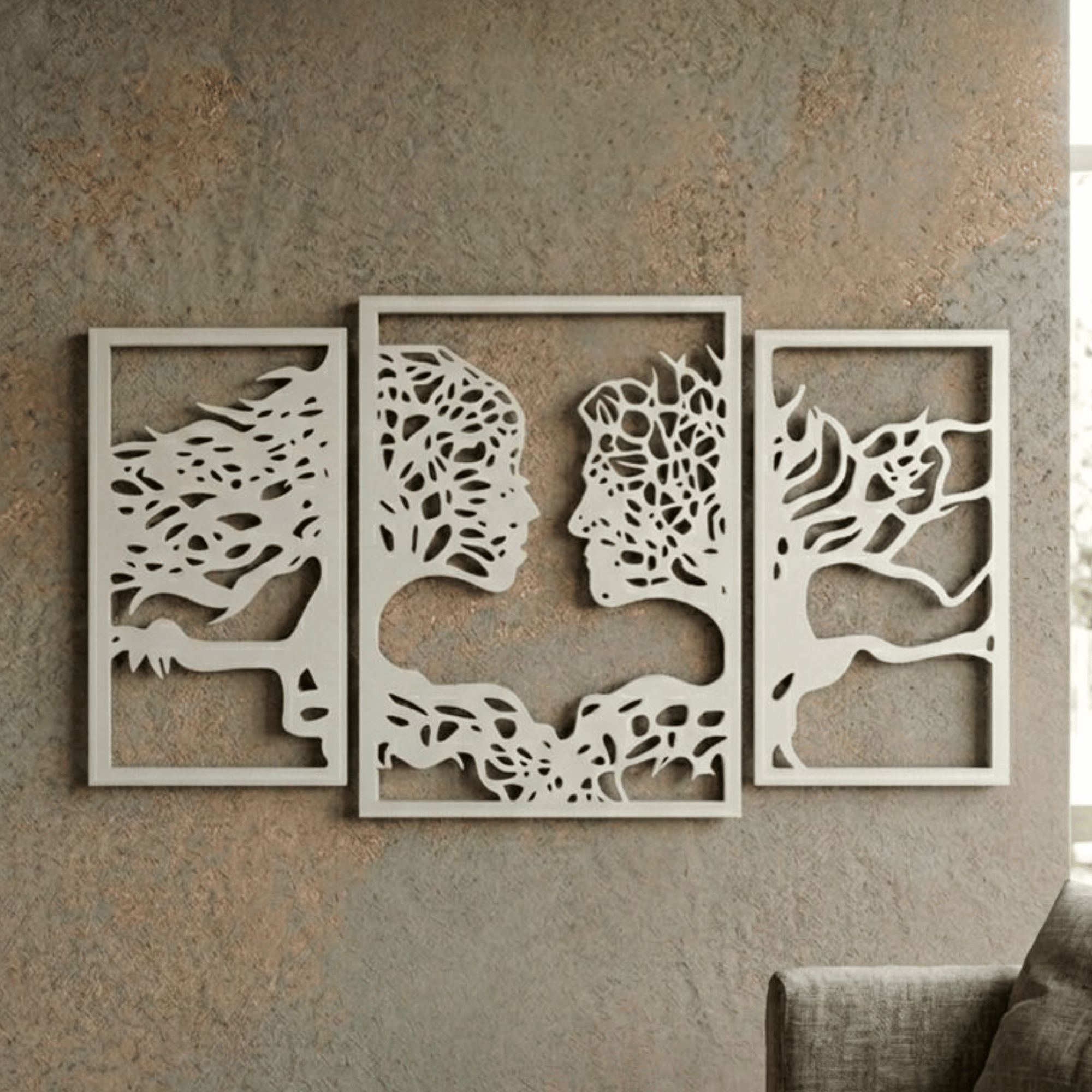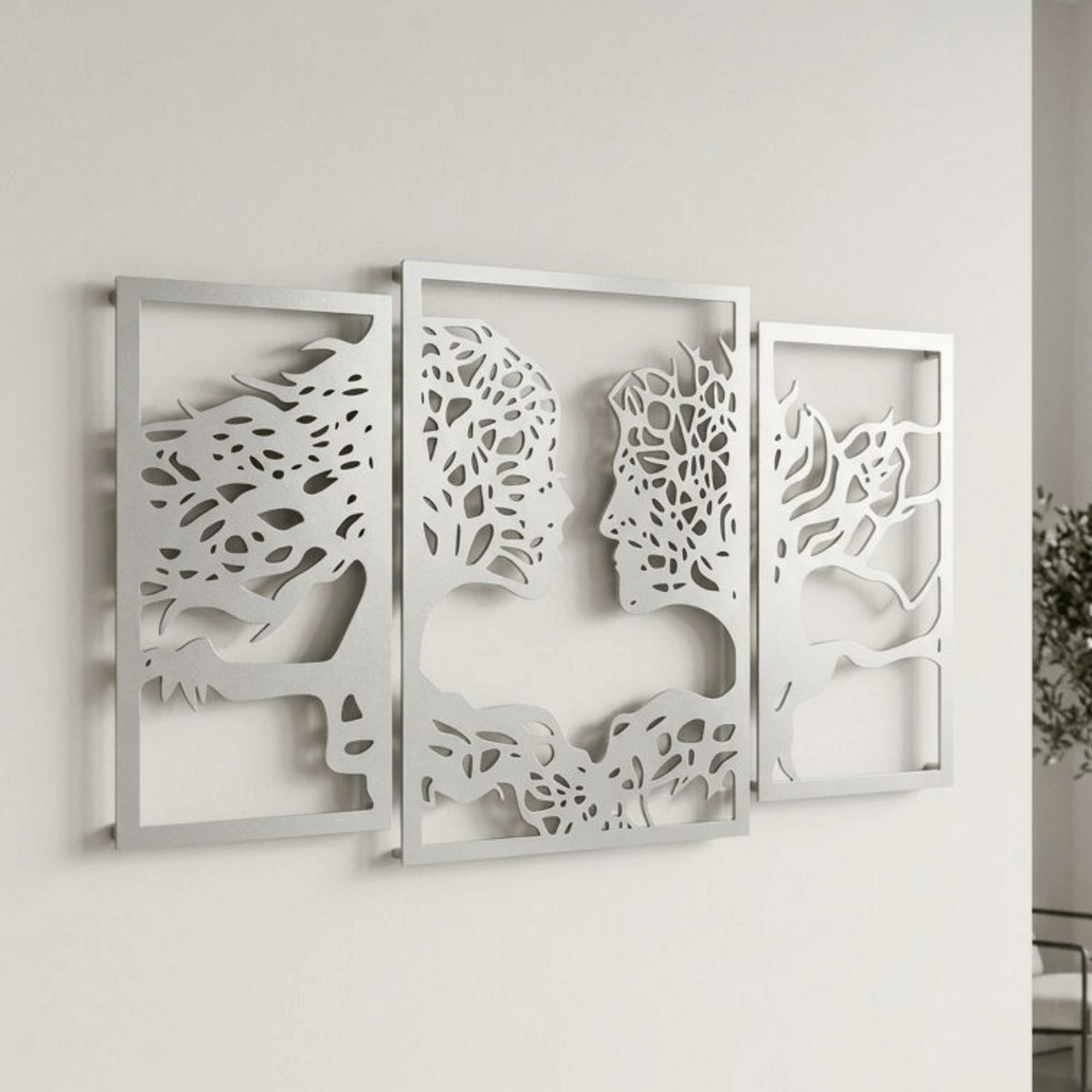 Sanat Eseri Detayları: Üç ayrı çerçeveli panelden oluşan bu kompozisyon, karmaşık lazer kesim teknikleriyle şekillendirilmiş. Tasarımda, ağaç dalları ve köklerinin organik ve karmaşık dokularıyla iç içe geçmiş iki insan yüzünün silüetleri görülüyor. Biri uzun saçlı, diğeri daha kısa saçlı bu iki form, birbirine doğru uzanıyor ve sanki birleşiyorlar, bu da organik ve insansı formların soyut bir birleşimini oluşturuyor.